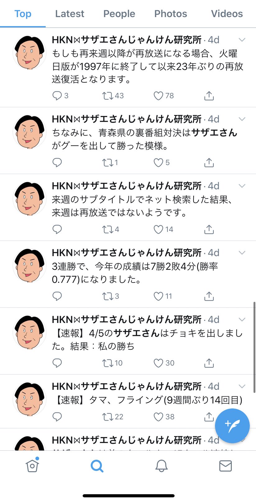 森下夏樹 Copywriter בטוויטר アニメ サザエさん のエンディングのじゃんけんを分析し 28年以上欠かさず勝負し続けている サザエさんじゃんけん研究所 所長の高木啓之さん 昨年の勝率は85 だそうで 過去2回だけ 93年と04年 4連続同じ手を出された時は 参り