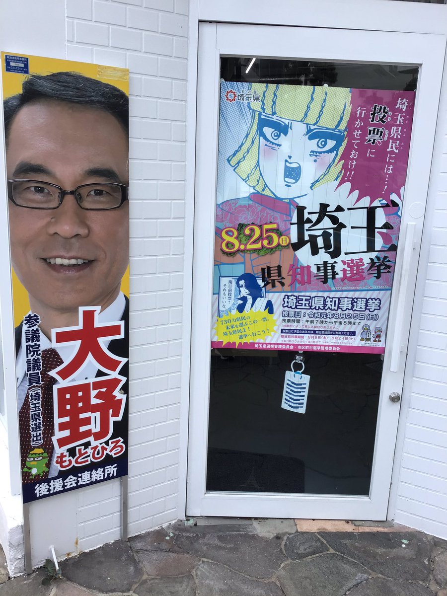 大野もとひろ 埼玉県知事 A Twitter 大野もとひろ事務所でも便乗して 埼玉県選挙管理委員会のポスターを掲示しています 写真撮影にもどうぞ 埼玉県知事選挙投票日は25日です 選管の翔んで埼玉コラボの啓発動画はフルボイス Https T Co 4skpbdpnzo 埼玉県知事
