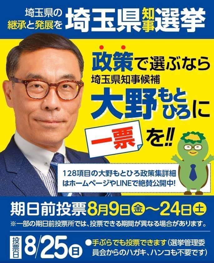 O Xrhsths 大野もとひろ 埼玉県知事 Sto Twitter 期日前投票に 埼玉県知事選挙 すでに期日前投票が始まっています 25日に都合のつかない方は是非 期日前投票をご活用ください 選挙管理委員会のpr動画 翔んで埼玉コラボ はこちら 埼玉県知事選挙啓発動画