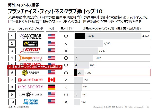 阿部 信太郎 Shintaro Abe على تويتر 米連邦破産法11条 日本の民事再生法に相当 の適用を申請し経営破綻したフィットネスジム ゴールドジム を運営する米ggiホールディングスは 世界第6位のフランチャイズクラブ数を誇る