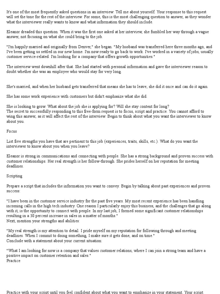 Don t feel like you have to answer all of them at once. This question is a way to break the ice and make you feel more comfortable during the interview process however some people might find this and other interview questions about you slightly stressful. Choose the right starting point for your story important your goal when answering tell me about yourself is to give a brief concise. Brainstorm why this position excites you how it fits into your larger career goals and why you feel it s the best next step.